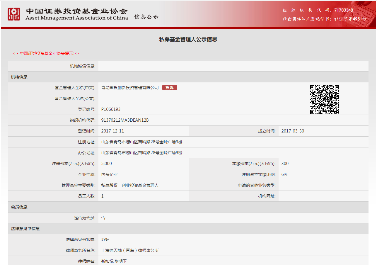 青島國投創(chuàng)新股權投資基金合伙企業(yè)(有限合伙),基金備案編號SCW873,規(guī)模500萬元;